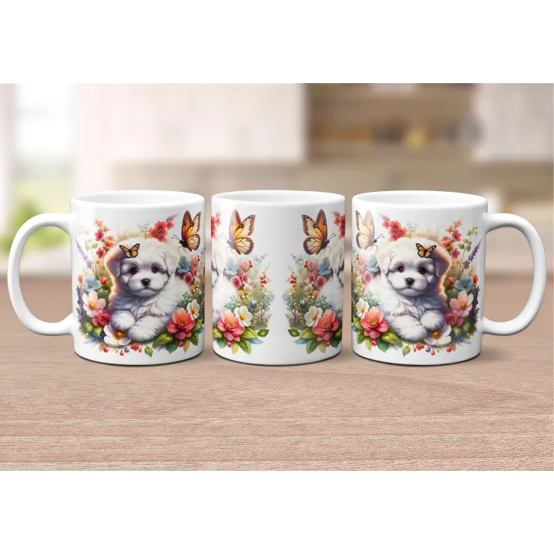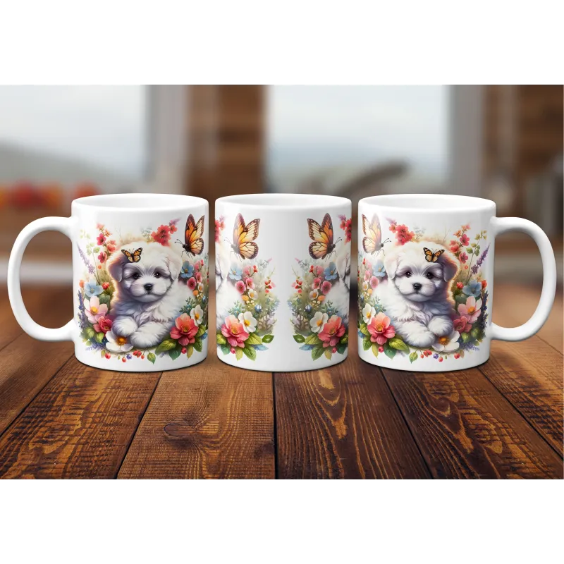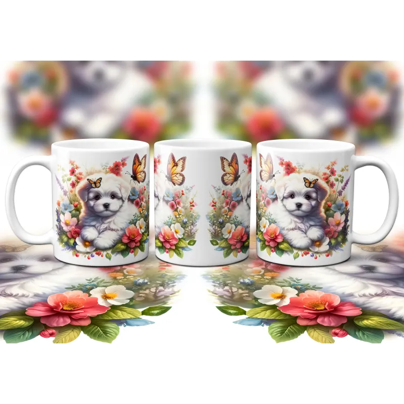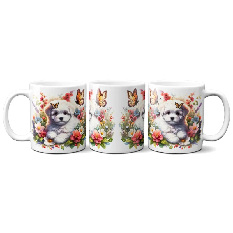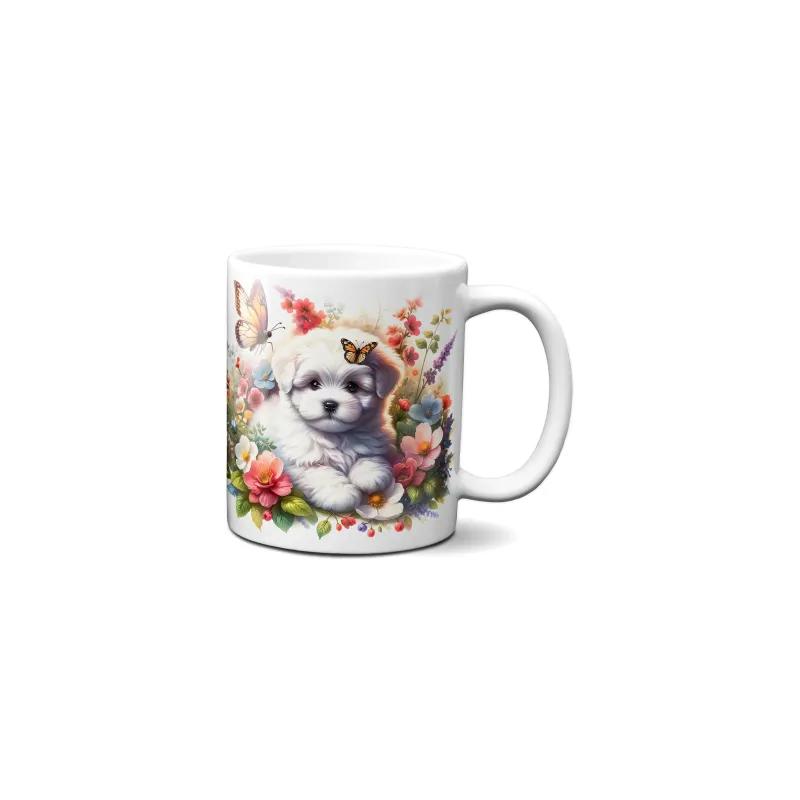 Dárkový hrnek Štěně v kvítí maltézský psík - bílý, s možností vlastního textu