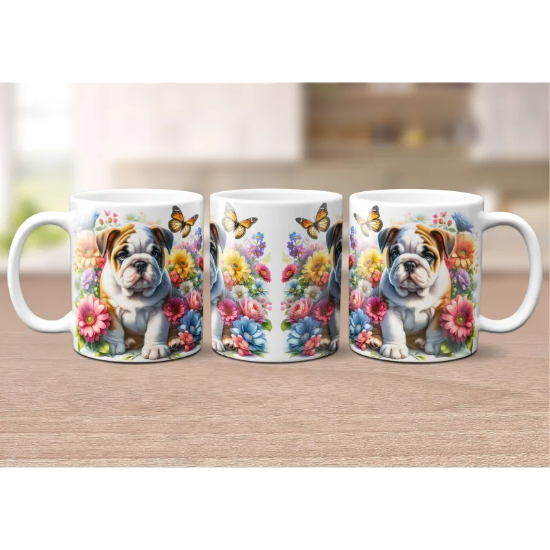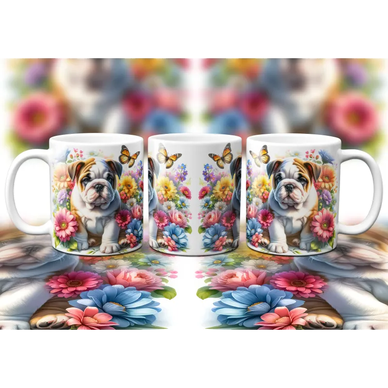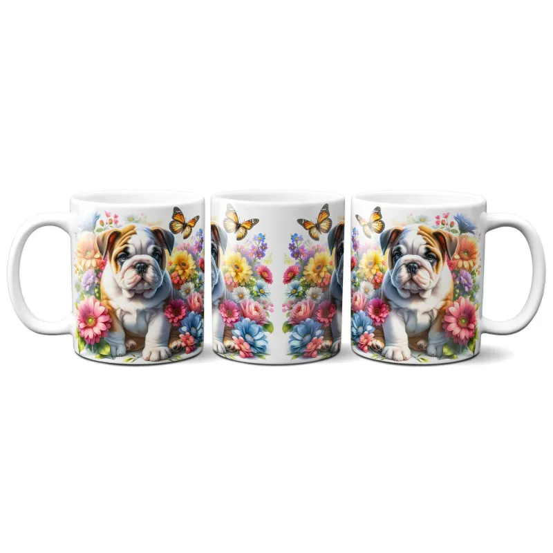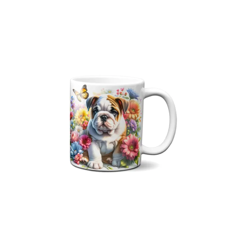 Dárkový hrnek Štěně v kvítí anglický buldok - bílý, s možností vlastního textu