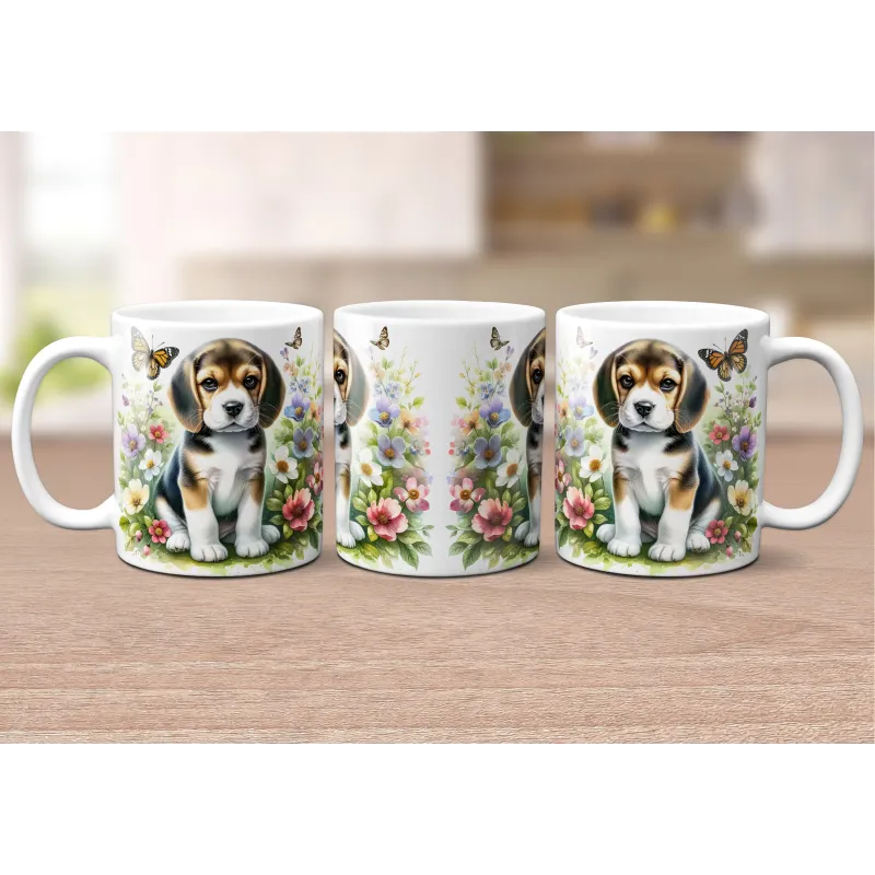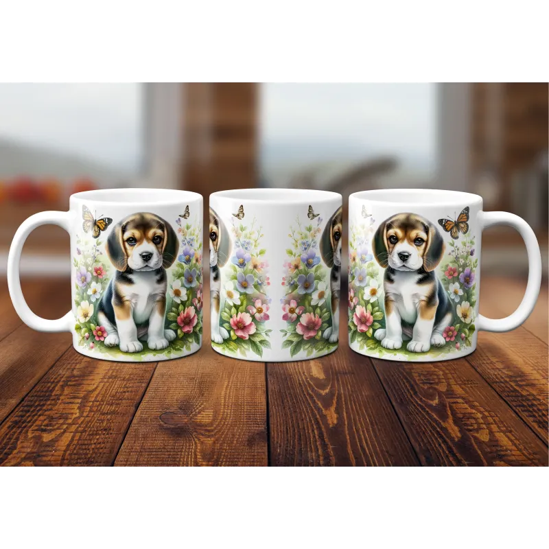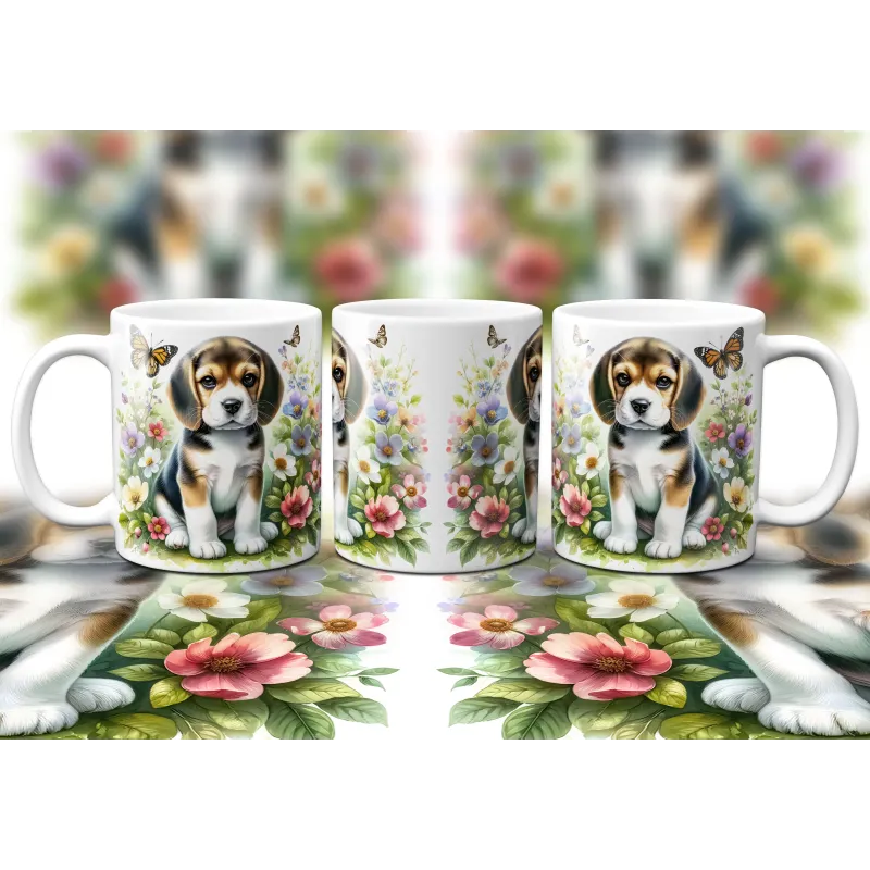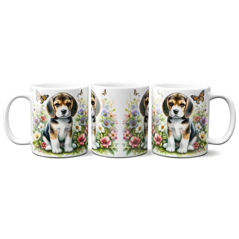 Dárkový hrnek Štěně v kvítí bígl - bílý, s možností vlastního textu