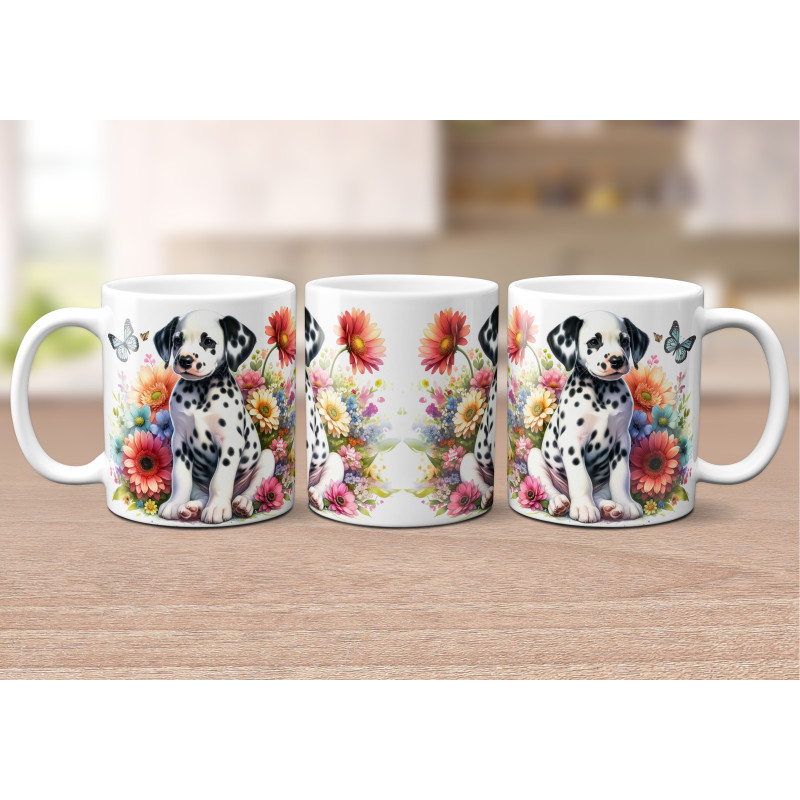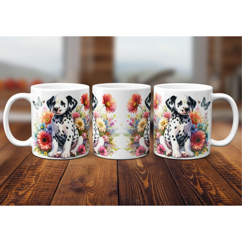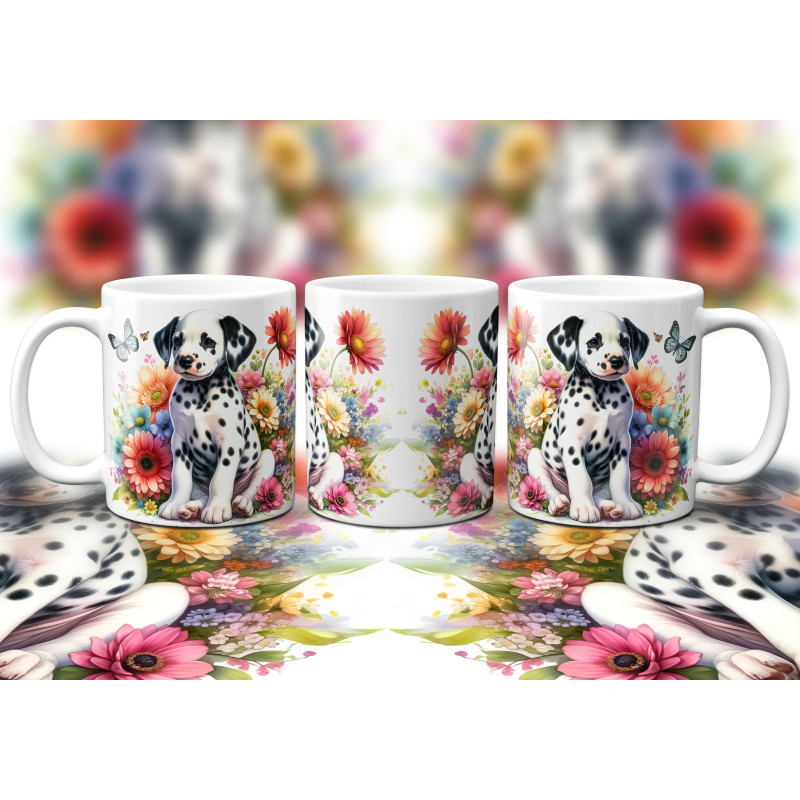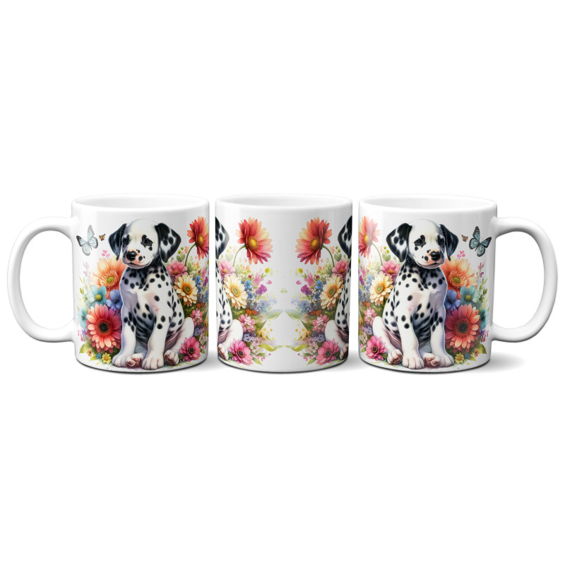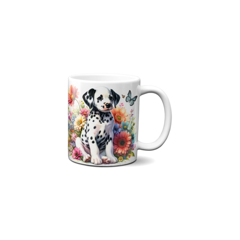 Dárkový hrnek Štěně v kvítí dalmatin - bílý, s možností vlastního textu