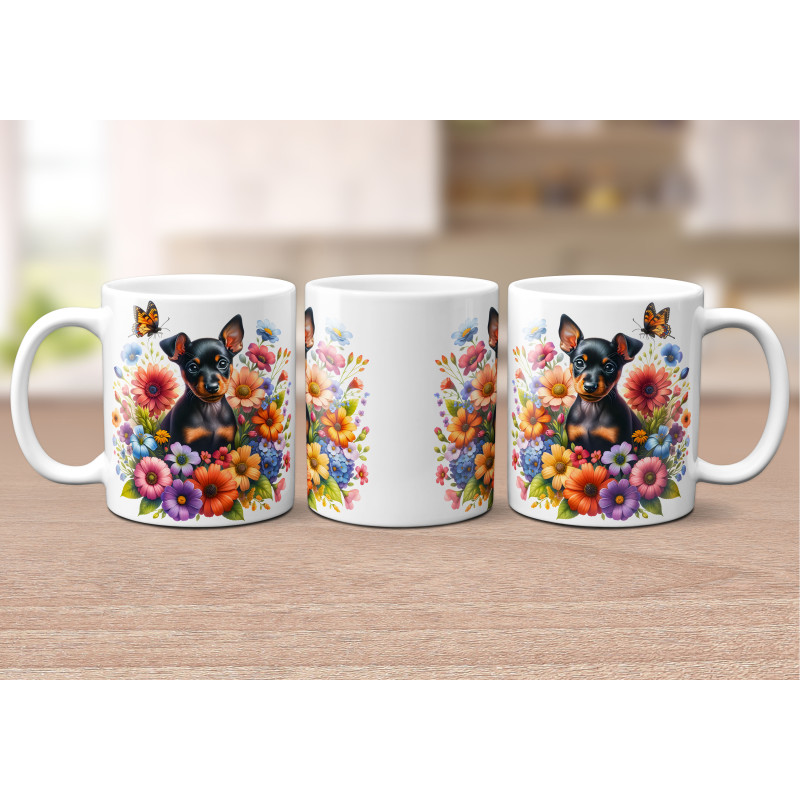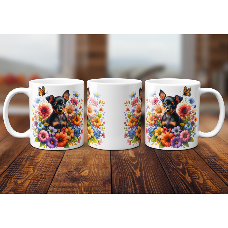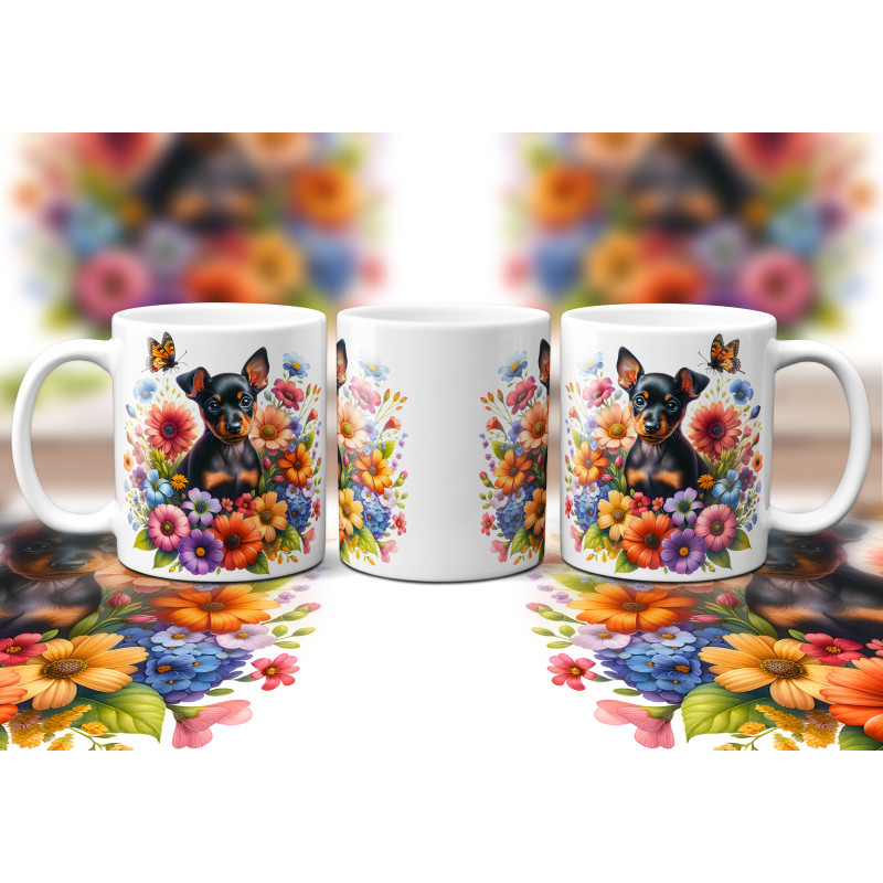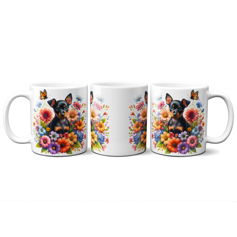 Dárkový hrnek Štěně v kvítí trpasličí pinč - bílý, s možností vlastního textu