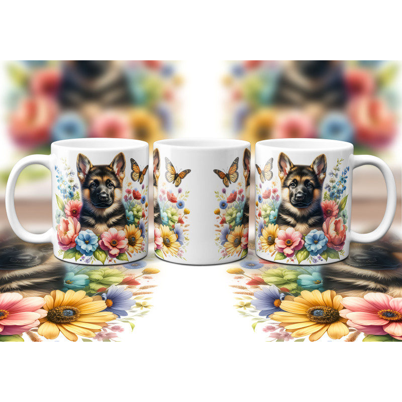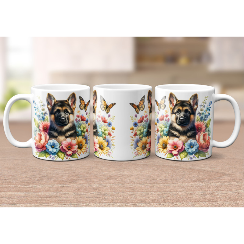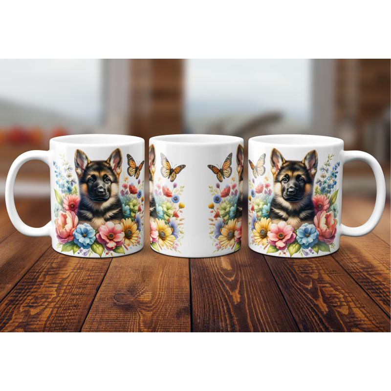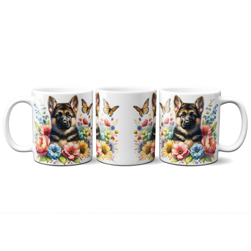 Dárkový hrnek Štěně v kvítí německý ovčák - bílý, s možností vlastního textu